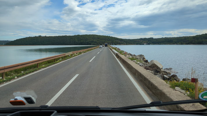 Am nächsten Tag brechen wir zeitig auf und kurven die restlichen Kilometer durch Slowenien. Die Salinen von Sečovlje liegen in der Bucht von Piran direkt an der Grenze zu Kroatien. Wir fahren mitten hindurch und genießen diesen herrlichen Ausblick. Auf den letzten Kilometern wird kräftig gebaut und wir holpern durch die Baustellen.