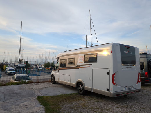 Selina und Chris haben sich für ein paar Tage eine Unterkunft in Koper gebucht und wollen später mit den öffentlichen Verkehrsmitteln nach Ljubljana weiterziehen. Wir verabschieden uns von den beiden und suchen uns ein Übernachtungsplätzchen in Izola. Ein großer Stellplatz am Yachthafen mit Blick auf's Meer für 18 Euro wartet schon auf uns. So'n Wohnmobil ist schon sehr praktisch. Hinstellen - fertig.