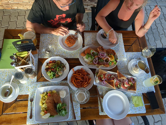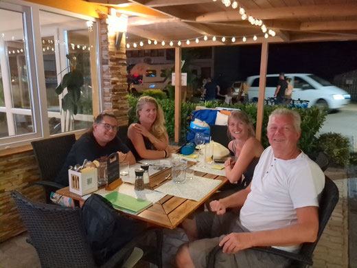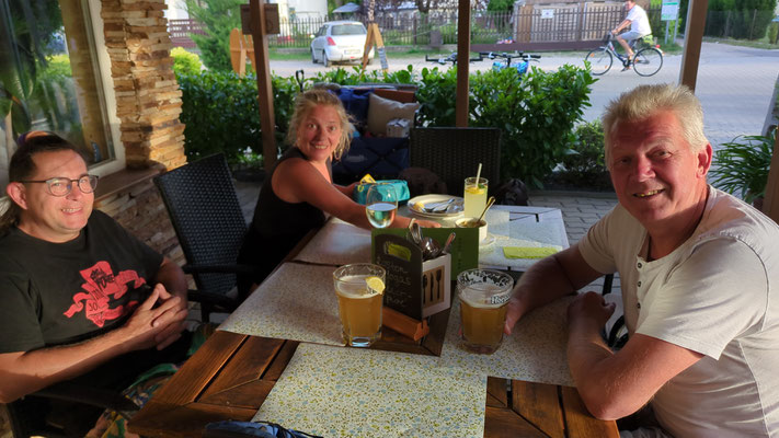 Wir haben bestes Badewetter um die 30 Grad und die Wassertemperatur steigt auf gute 26 Grad an. Da bleibt uns nichts anderes als zu baden, faulenzen, reden und natürlich gemeinsam Essen zu gehen. Delta übernimmt, wie immer, die Regie bei allen Bestellungen und Interaktionen mit den Einheimischen. Wir geben brav unsere Essens- und Getränkewünsche an Delta und sie parliert im feinsten Ungarisch mit den Kellnern. Hiervon mehr, davon weniger, dies extra ..., so geht es uns bestens und wir werden gut versorgt.