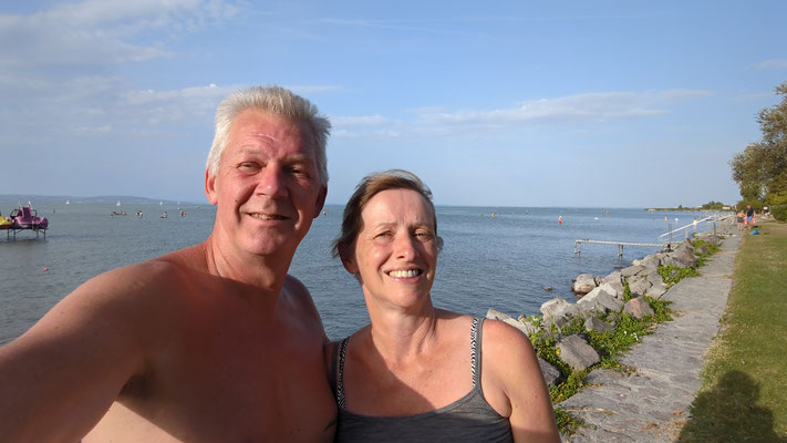 Wir fahren am nächsten Tag mit unseren Fahrrädern zum ca. 5 km entfernten Strand von Zamárdi, wo wir uns wie gewohnt mit Delta und Felix treffen. Die beiden kommen extra aus dem Norden Ungarns mit ihrem Camper angereist, damit wir zwei Tage zusammen verbringen können.